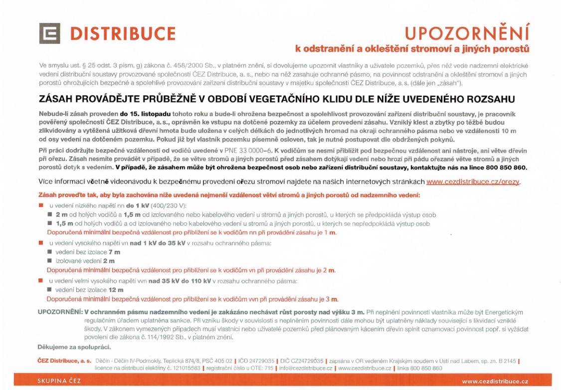 Upozornění k odstranění a okleštění stromoví a jiných porostů